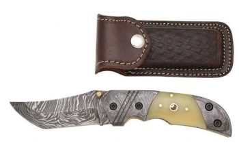 Real damascus folding knife comes with leather sheath to protect from stains and sharp blade. Folding is also a EDC for different purposes.Handle is made of bone.